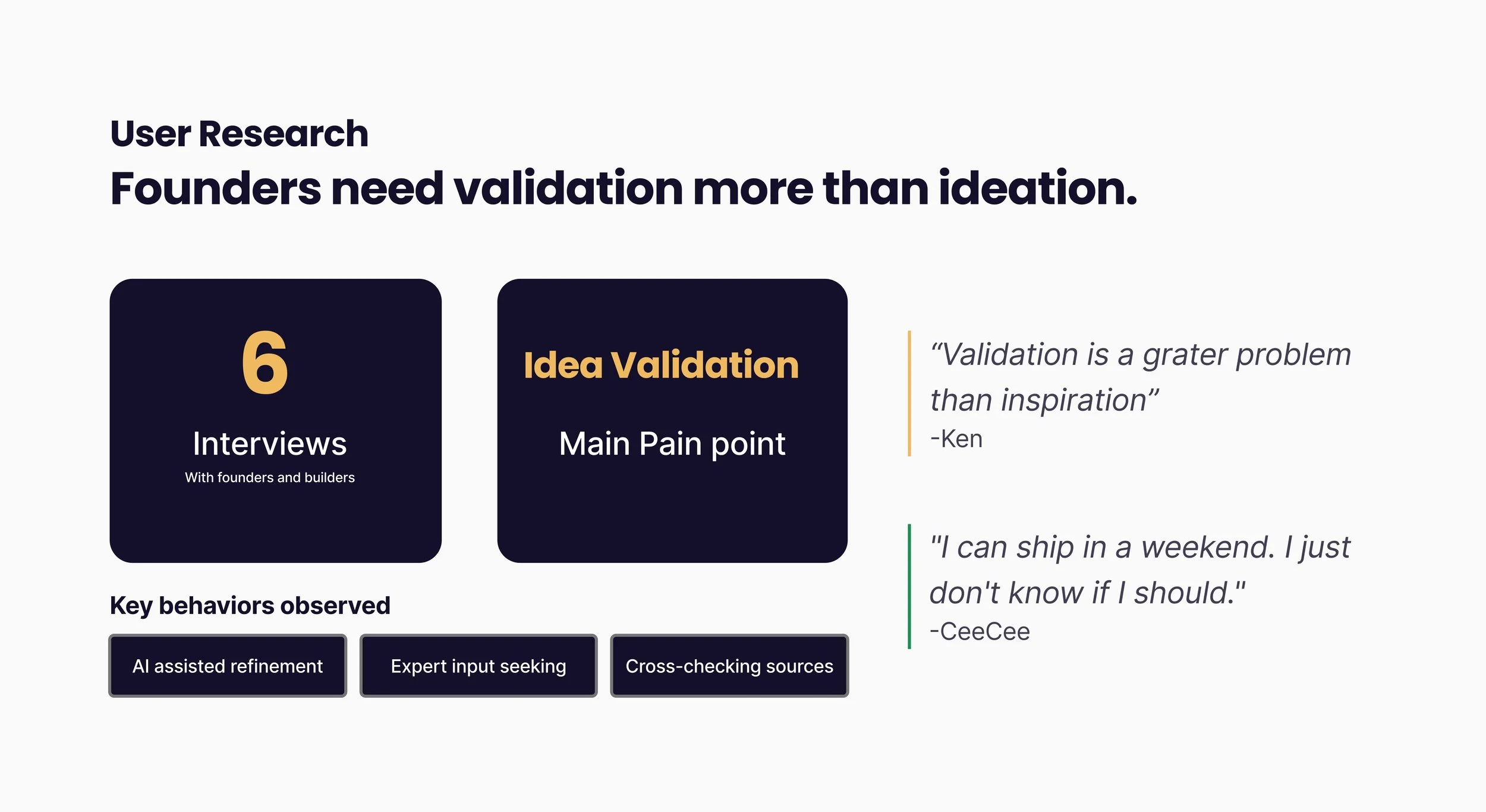 We ran structured interviews and heard the same thing over and over: founders get their ideas from personal experience, from problems they've lived, from frustrations they couldn't shake. The ideation wasn't broken. Validation was the missing piece.